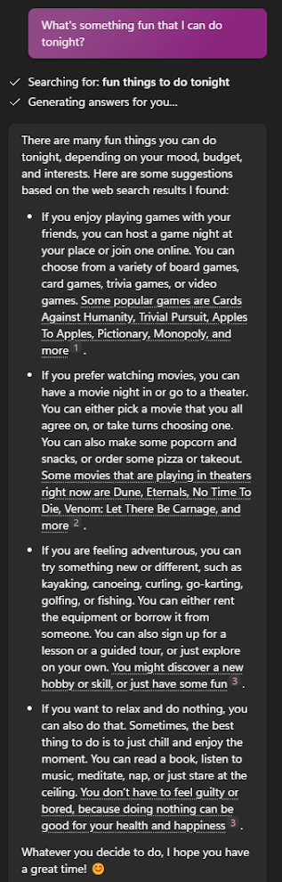 Upon launching CoPilot, users are presented with the option to type or speak requests. In my interaction, I asked, "What's something fun I can do tonight?" The response, delivered in typical AI-powered chatbot fashion, offered suggestions. However, the suggestions were movies that had been in theaters two years prior, raising questions about the timeliness and accuracy of the information.